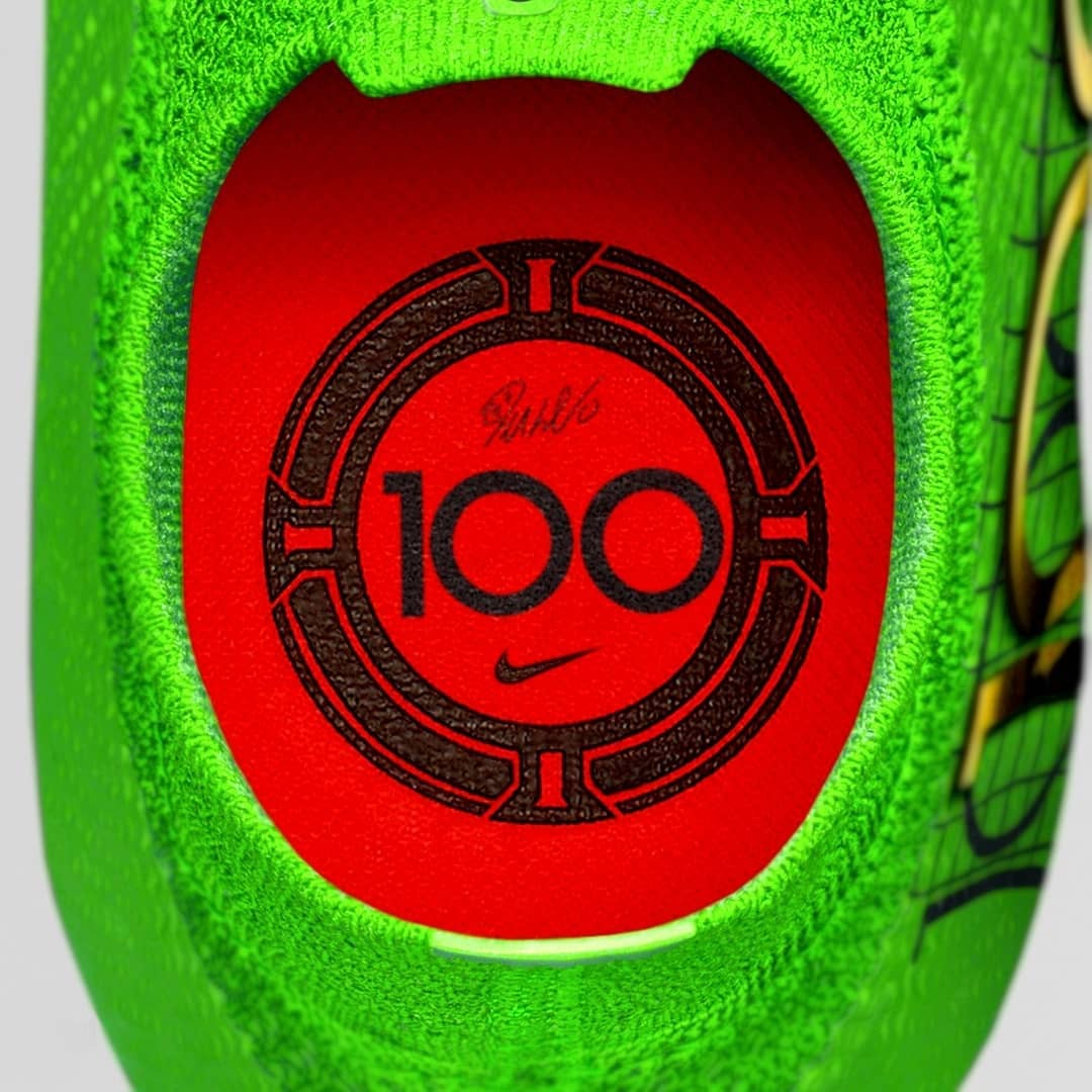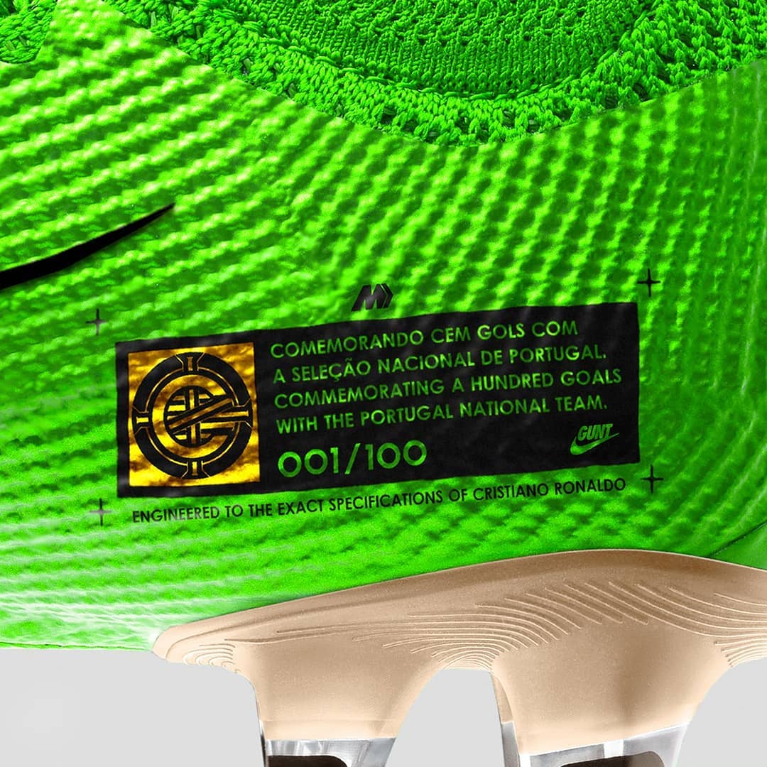 Die Nike "Cristiano 100" Mercurial Superfly VII Elite Fussballschuhe sind mit verschiedenen Elementen ausgestattet, um die 100 Tore von CR7 zu ehren, darunter ein schwarzes Etikett auf dem Spann und ein goldenes CR7-Logo auf der Außenseite.