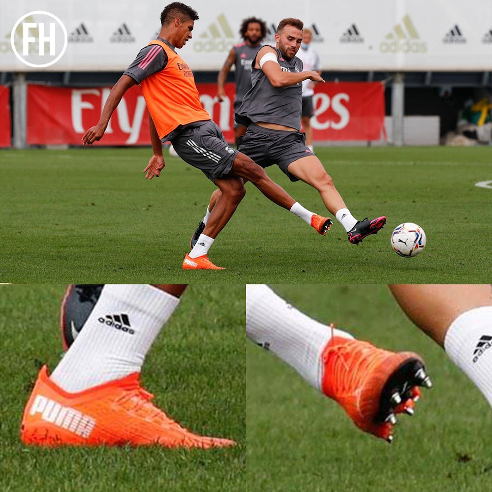 Raphaël Varane wurde im Training in der SG-Version der Puma Ultra Schuhe gesichtet - dies deutet darauf hin, dass er einen Sponsorenvertrag mit Puma unterzeichnen könnte.