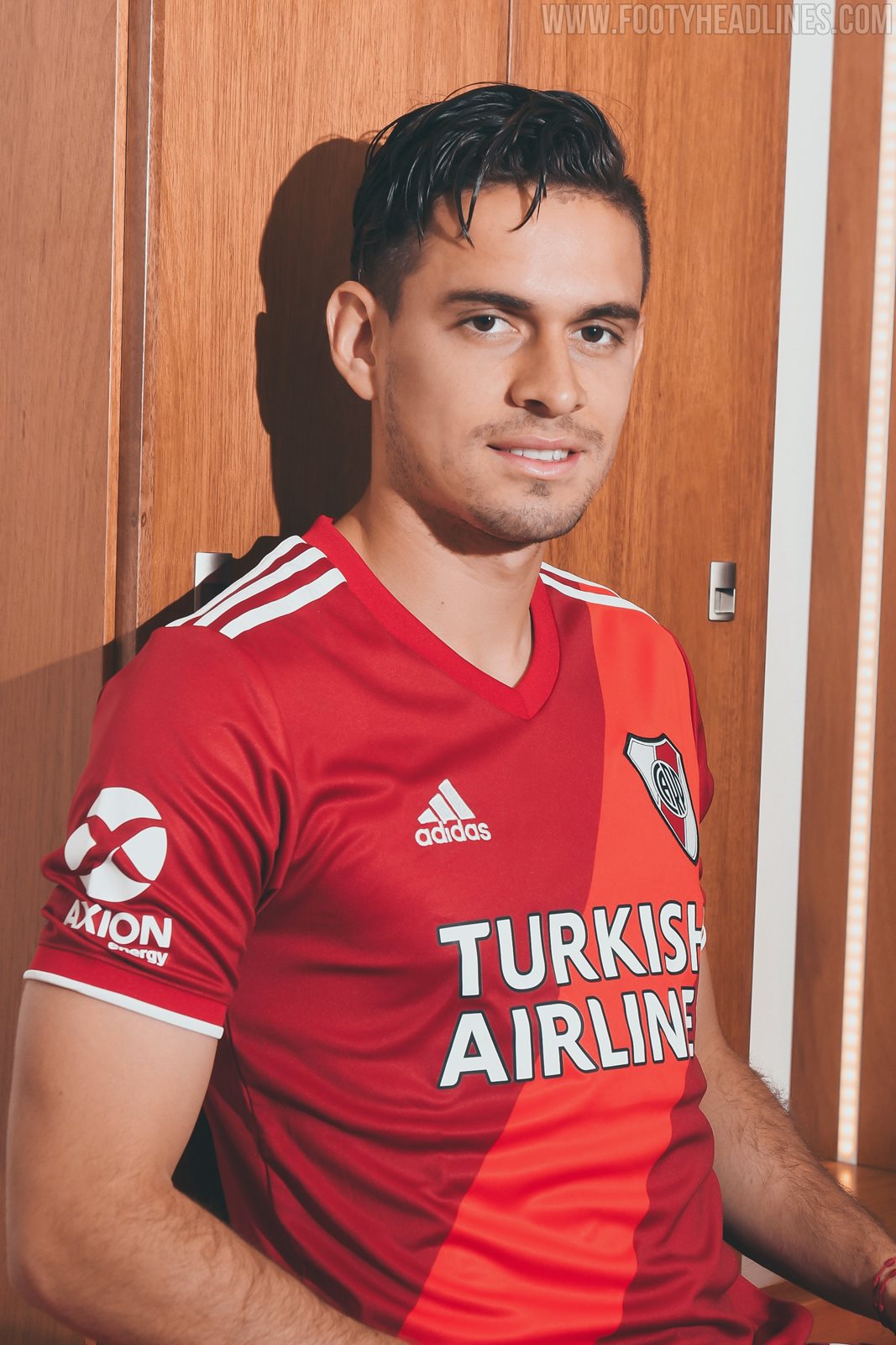 Das Adidas River Plate 2020-21 Trikot, das vom berühmten weiß-roten Heimtrikot mit Schärpe inspiriert ist, ist rot, wobei ein hellerer Rotton für die Schärpe verwendet wird.