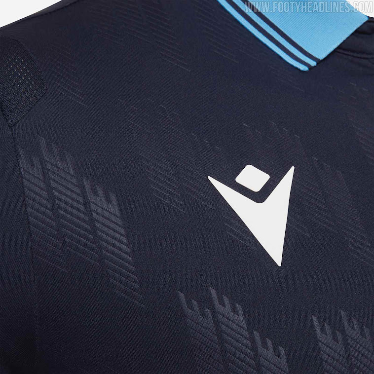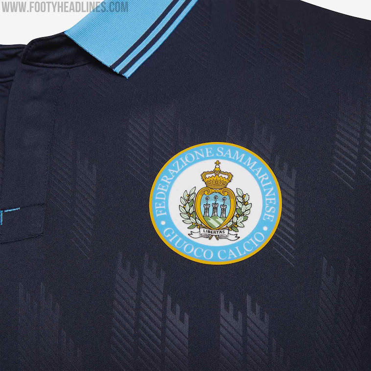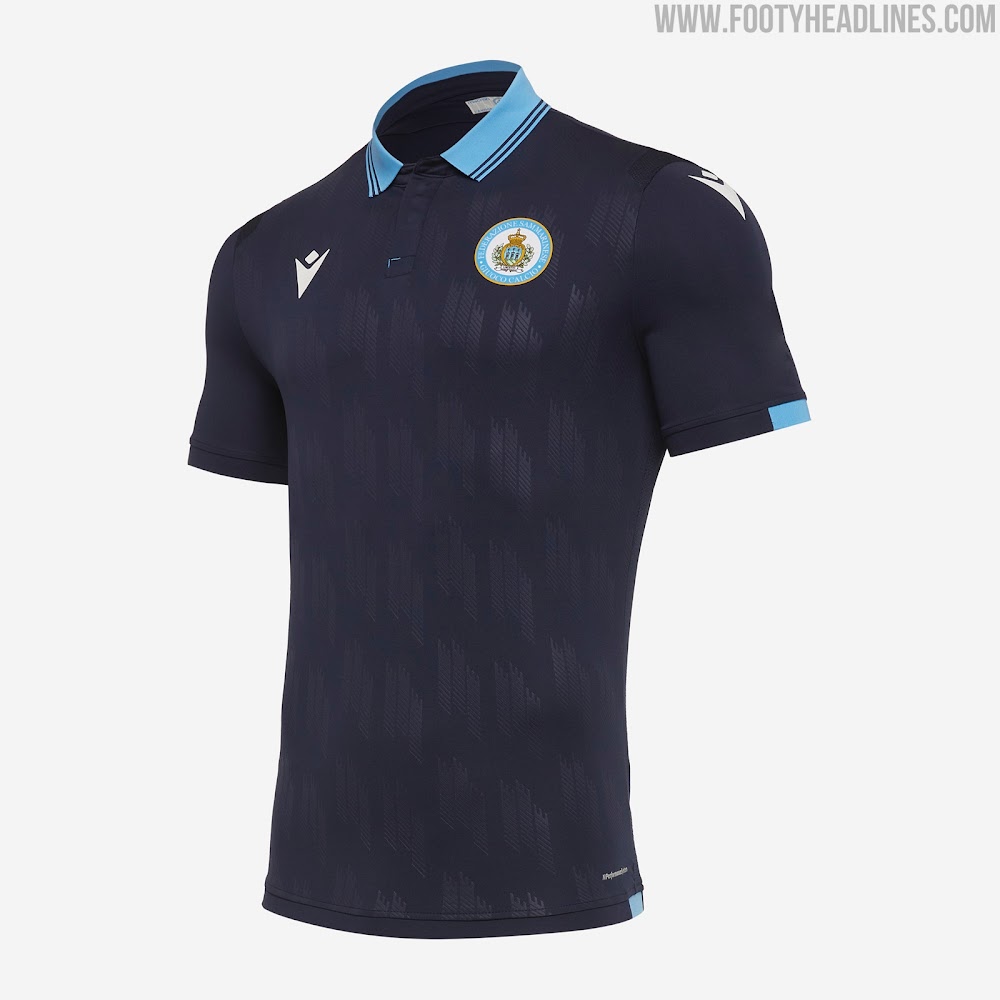 Das zweite Macron San Marino 2020 Fussballtrikot, das auf der gleichen Vorlage basiert, ist dunkelblau mit einem himmelblauen Kragen und teils himmelblauen Ärmelenden. Ein anderes Jacquardmuster befindet sich auf der Vorderseite.