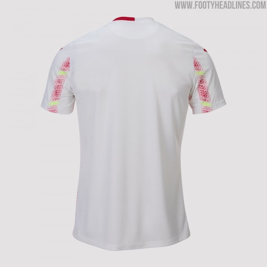 Das zweite Joma Spanien Futsal 20-21 Trikot, das auf der gleichen Vorlage basiert, ist größtenteils weiß mit einem atemberaubenden Grafikdruck in Rot und Gelb auf den Seiten und Ärmeln. Dieser Druck besteht aus kleinen Formen, die an den Buchstaben "Y" erinnern, während der Kragen halb rot, halb weiß ist.