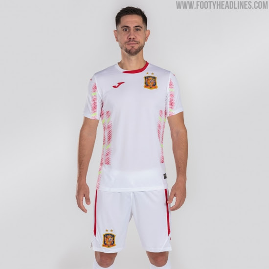Joma kombiniert das Spanien Futsal 2020-21 Fussballtrikot mit weißen Hosen und Stutzen.