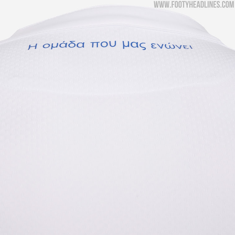 Das zweite Macron Zypern 2020 Trikot, das auf der gleichen Vorlage basiert und die gleichen Details aufweist, ist weiß mit blauen Details und Verzierungen.