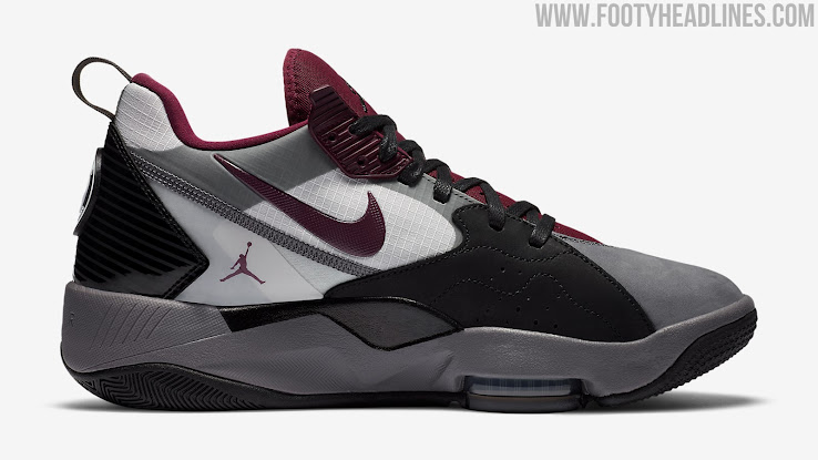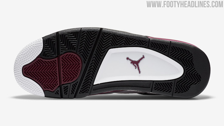 Das Kernstück der Sneaker-Kollektion ist der Air Jordan 4, der eine weiße Basis mit Bordeaux und Schwarz über der Sohle und dem Obermaterial kombiniert, was sich eng an die Farbgebung des Trikots anlehnt.