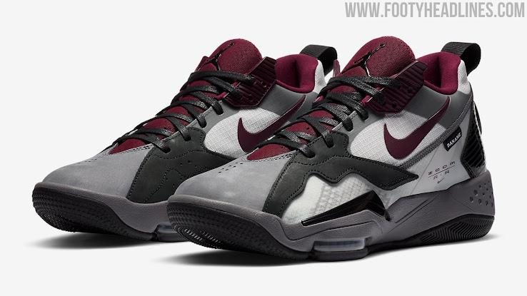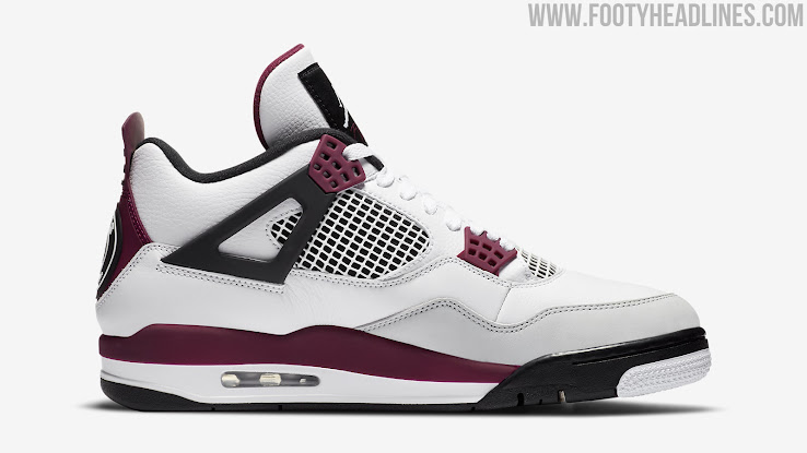 Das Kernstück der Sneaker-Kollektion ist der Air Jordan 4, der eine weiße Basis mit Bordeaux und Schwarz über der Sohle und dem Obermaterial kombiniert, was sich eng an die Farbgebung des Trikots anlehnt.