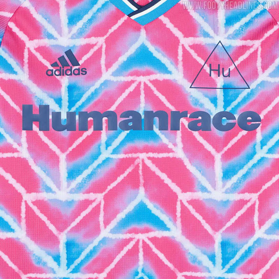 Das Human Race Trikot ist eine Neuerfindung des klassischen Fussballtrikots und weist ein handgezeichnetes Design auf, das die geometrischen Muster des Adidas 1988 Templates nachahmt.