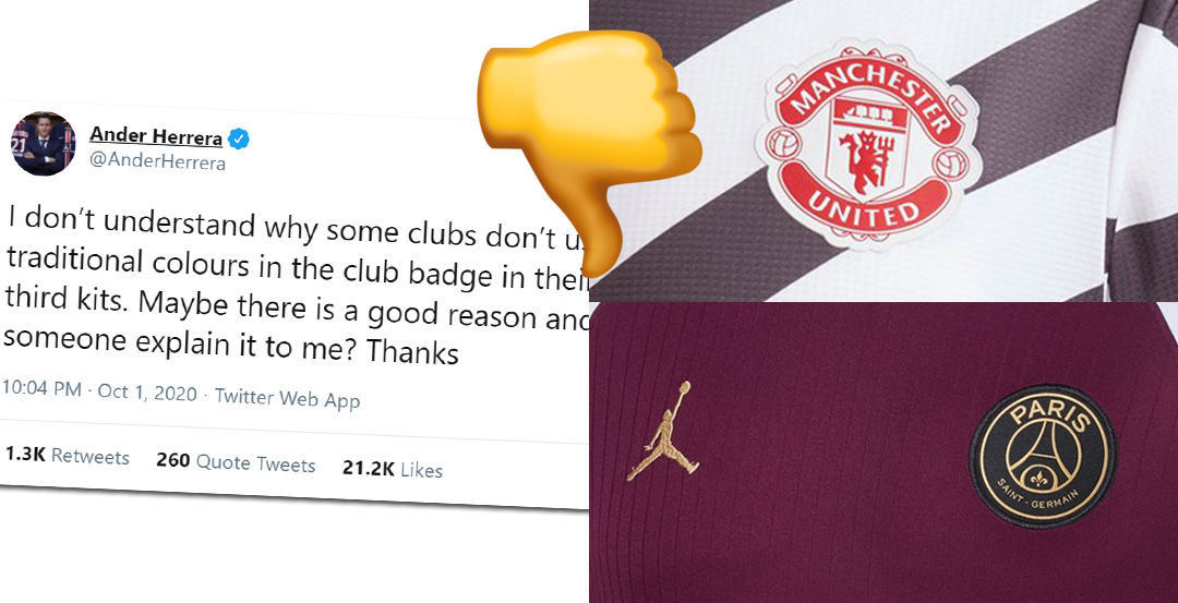 Der aktuelle Club von André Herrera, PSG, färbt sein Clublogo regelmäßig neu. Der Club hat sein Vereinswappen für das Ausweichtrikot 2020/21 (hergestellt von Jordan) neu eingefärbt - das erste neu eingefärbte Wappen hatten sie mit Nike in der Saison 2015/16.