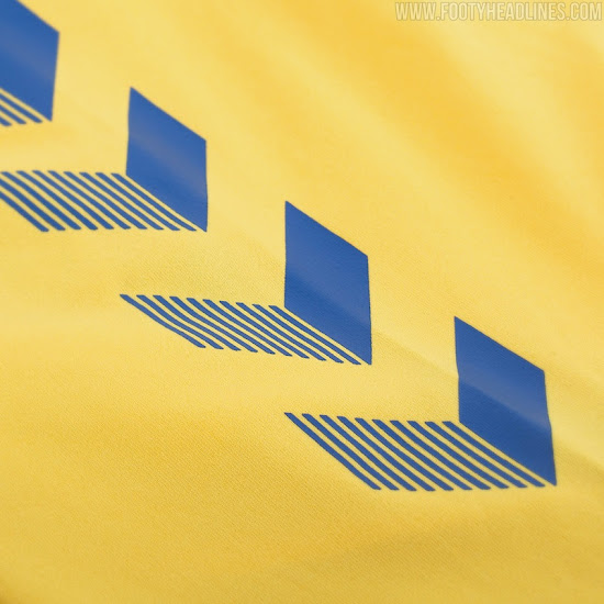 Das Brøndby IF 2020-2021 Trikot ist goldgelb mit einem blauen Band um die Brust.