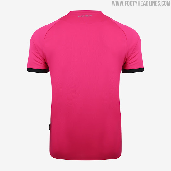 Das dritte Umbro Derby County 2020-2021 Trikot ist in den Farben Pink, Schwarz und Weiß gehalten. Die Hauptfarbe wird offiziell "beetroot" (Rote Bete) genannt.