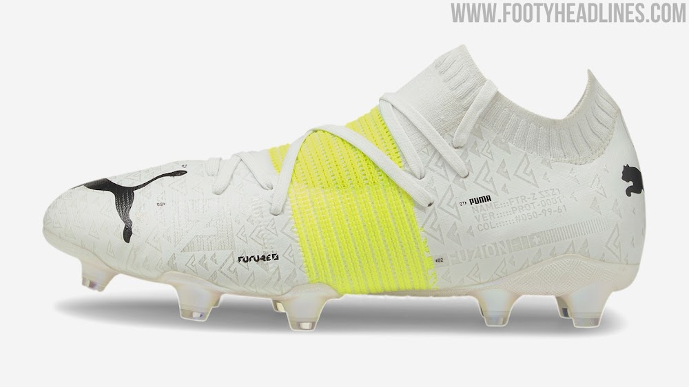 Was die Merkmale betrifft, so sind die weiß-schwarz-gelben Puma Future Z 1.1 "Teaser" Schuhe so wie die reguläre Erstausgabe.