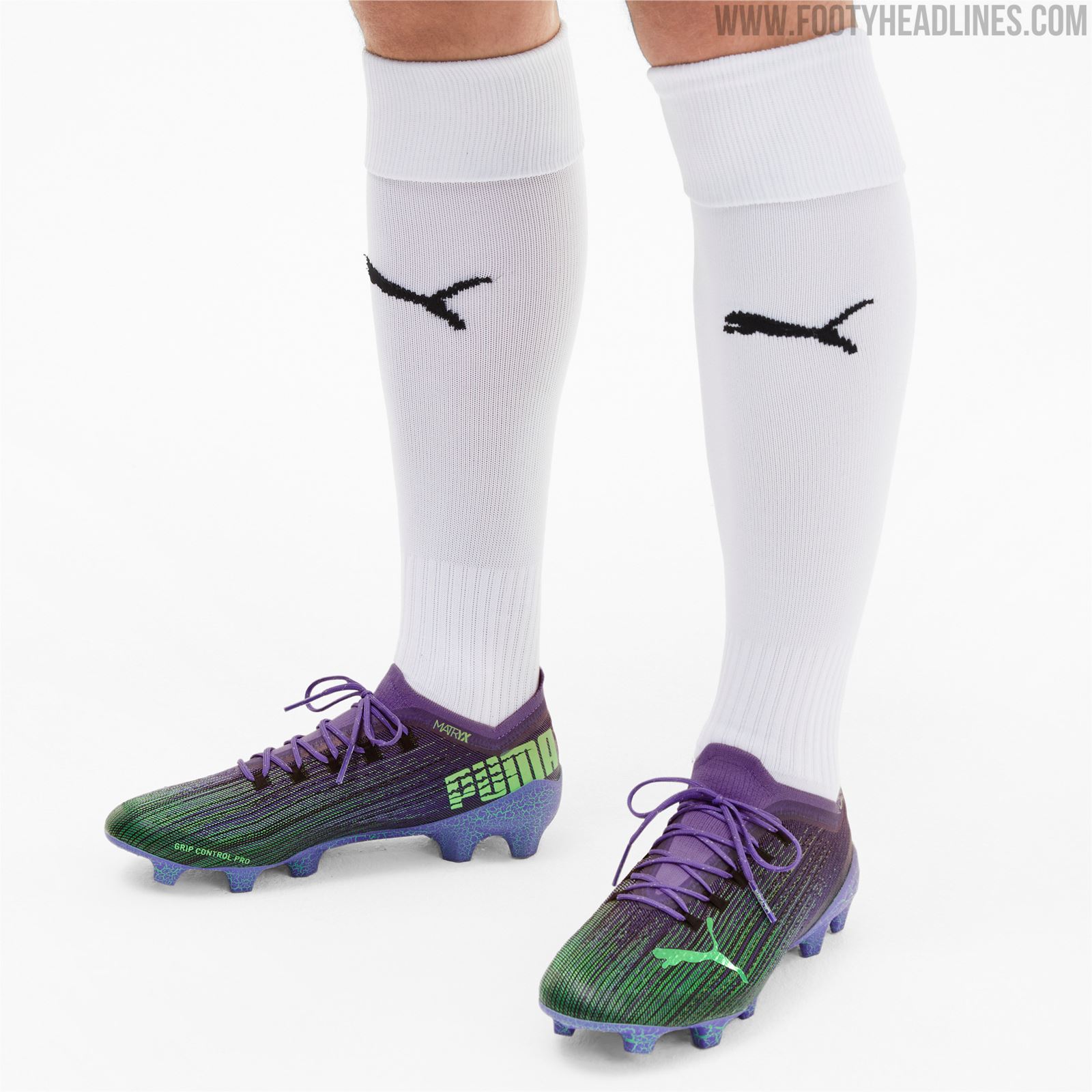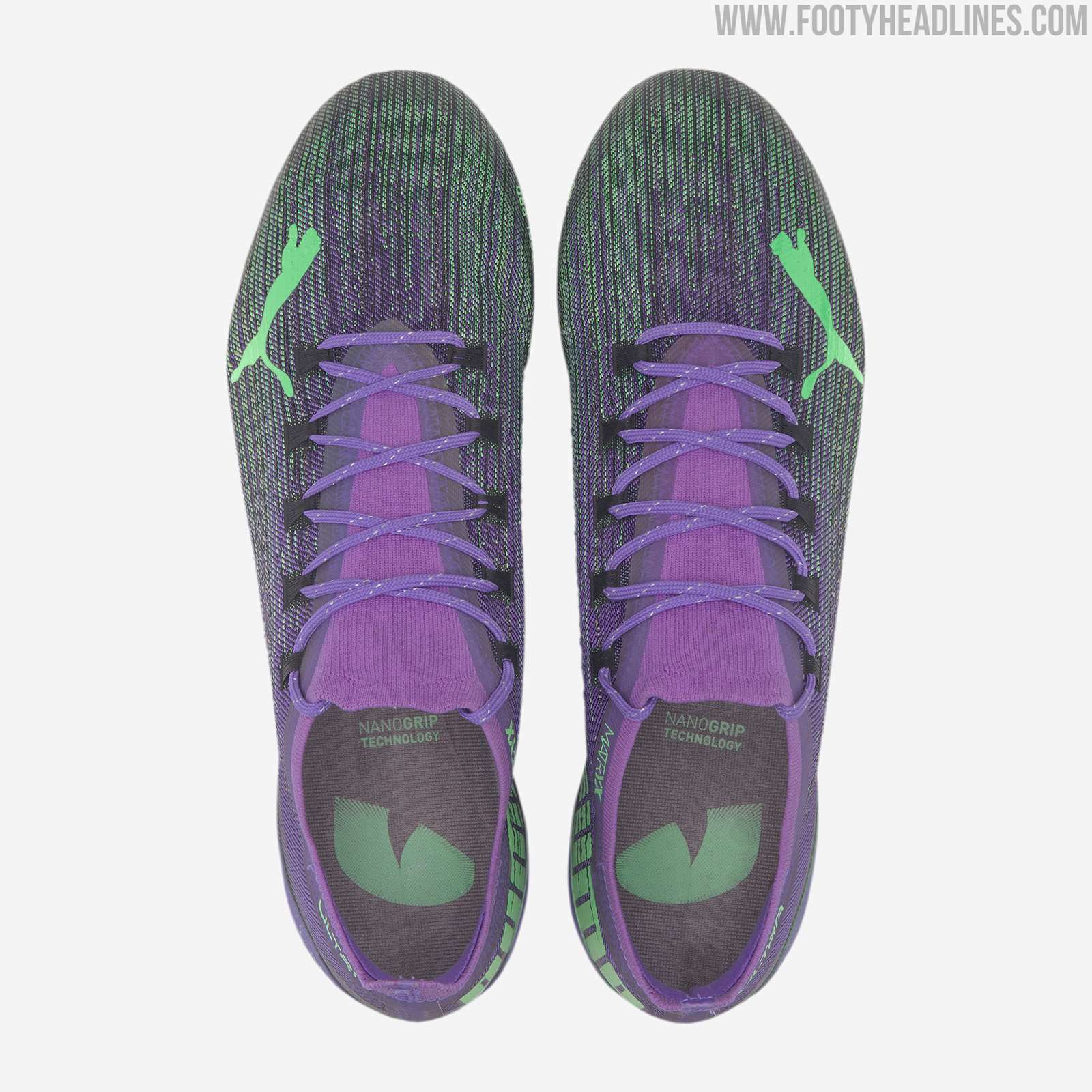Die ebenfalls überwiegend lilafarbenen Puma "Fear" Ultra 1.1-Fußballschuhe weisen mehr Grün in Form einer Verlaufsgrafik auf dem Obermaterial auf. Die Sohlenplatte ist violett mit dem Markenzeichen des Modelle in "Elektrogrün".