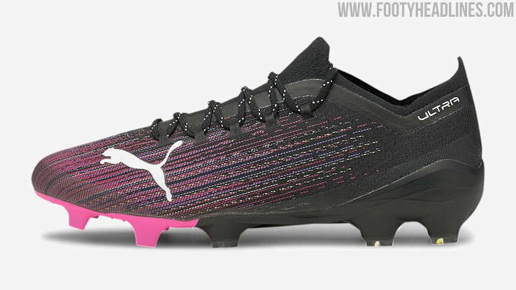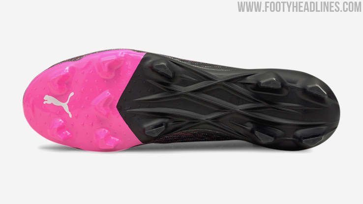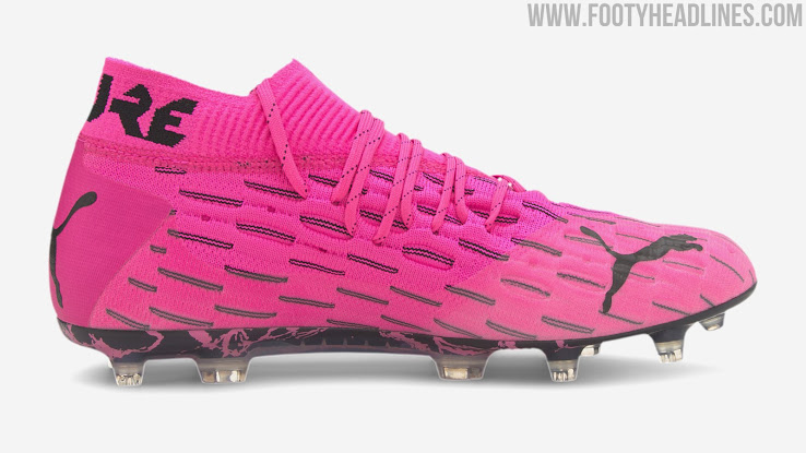 Basierend auf der Puma Future 6.1-Generation, die vor der Saison 2020/21 debütierte, sind die neuen Fußballschuhe hauptsächlich in kräftigem Pink mit schwarzen Akzenten auf der Oberstruktur und in Form der Logos gehalten. Die Sohlenplatte ist ebenfalls schwarz.