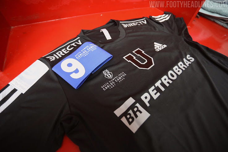 Das hauptsächlich schwarze Spezialtrikot von Adidas Universidad de Chile 2020-2021 hat einen sehr cleanen Look, der mit weißen Akzenten gepaart ist und sich auf die kleinen Details konzentriert, um Campos zu erinnern. Zum einen befindet sich unter dem Vereinslogo der Schriftzug 'hasta siempre dolo - Carlos Campos - 1937 - 2020' (Abschiedsidol). Die besondere Armbinde enthielt dieselbe Botschaft, zusätzlich zu Campos' Nummer 9.
