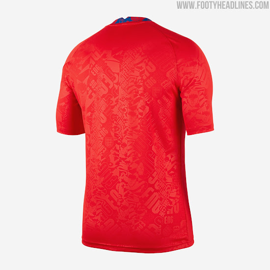 Das überwiegend rote Nike England 2020 Pre-Match-Shirt hat einen Jacquard-All-Over-Print, der - rot auf blau - auf dem Rundhalskragen stärker hervorsticht - all das basiert auf der neuen Nike-Template.