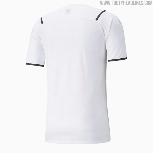 Wie auf den Auswärtstrikots der Puma 21-22 Nationalmannschaften zu sehen, haben die neuen Puma 21-22 Vereinsdrittel Trikots die Teamnamen in groß zwischen zwei horizontalen Linien auf der Vorderseite. Auf der Vorderseite aller Puma 21-22 Trikots befindet sich ein sublimiertes Muster mit den Wappen der Mannschaften. Die Vereinswappen sind auch auf der oberen Rückseite jedes Trikots aufgedruckt.