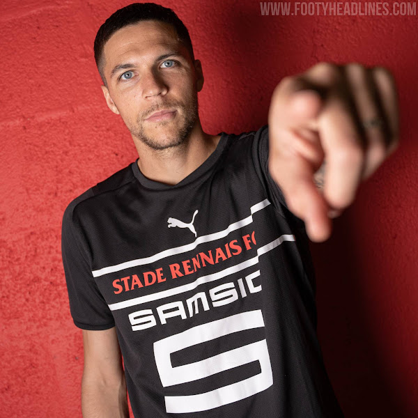 Das Puma Stade Rennais 2021-22 dritte Trikot ist schwarz mit weißen Logos sowie zwei weißen horizontalen Streifen auf der Brust, die einen großen roten 'Stade Rennais FC' Schriftzug einrahmen.