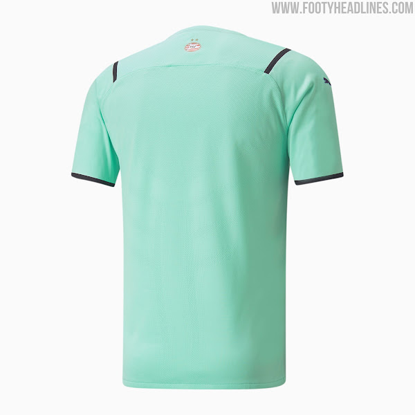 Ein sehr frischer Look, das Puma PSV Eindhoven 2021-22 dritte Fußballtrikot kombiniert die Hauptfarbe"green glimmer" mit"astral aura". Es ist eine Farbkombination, die nicht traditionell für den Verein ist. Aber das war bei den meisten dritten PSV Trikots in den letzten Jahren der Fall.