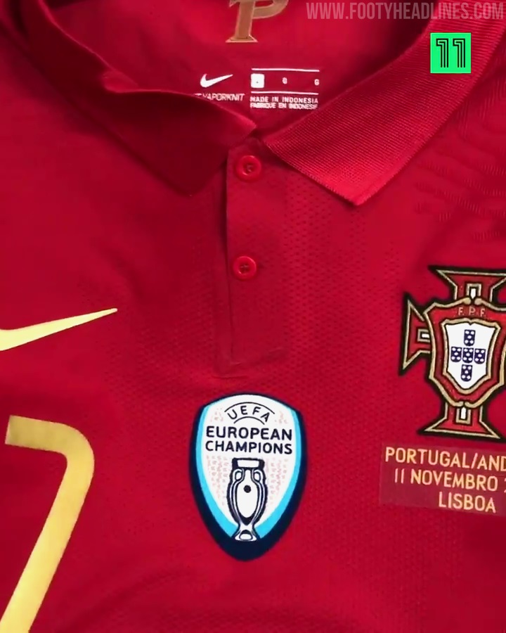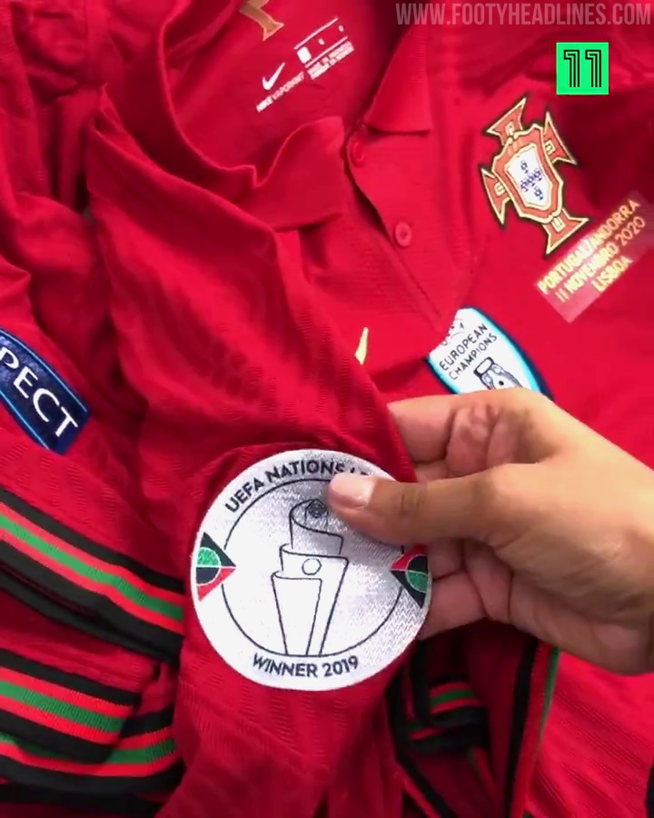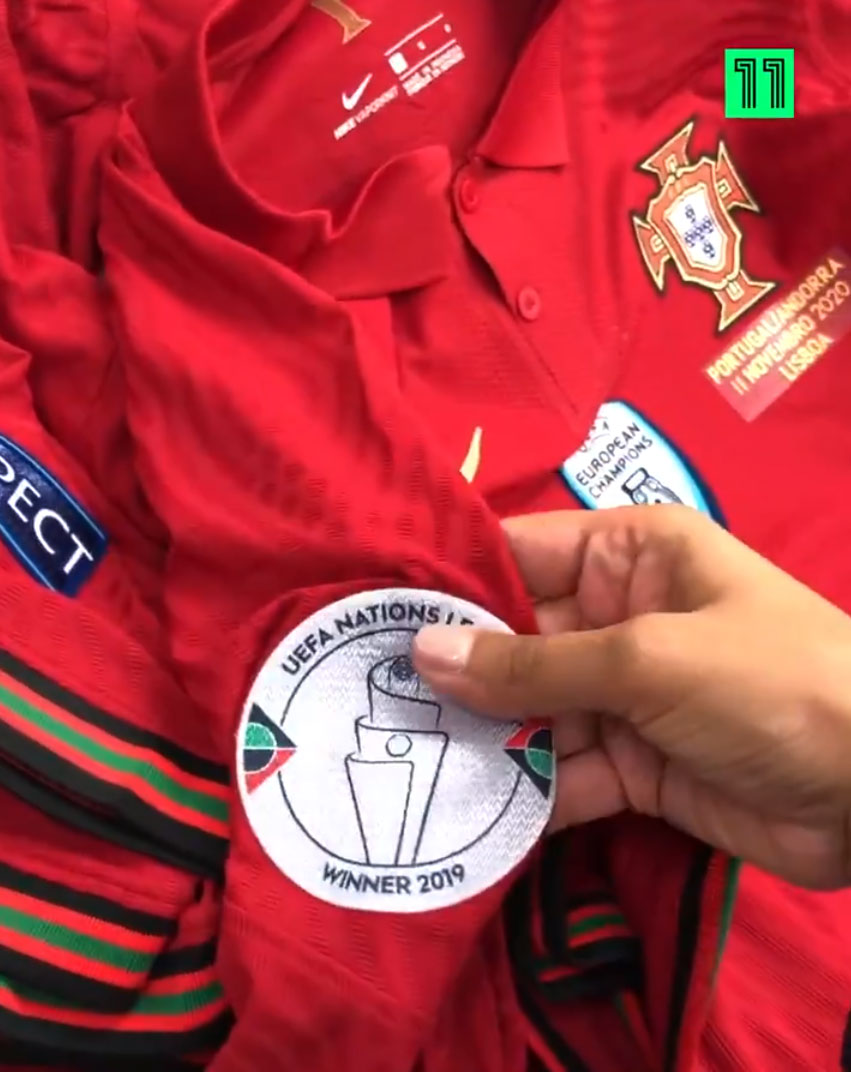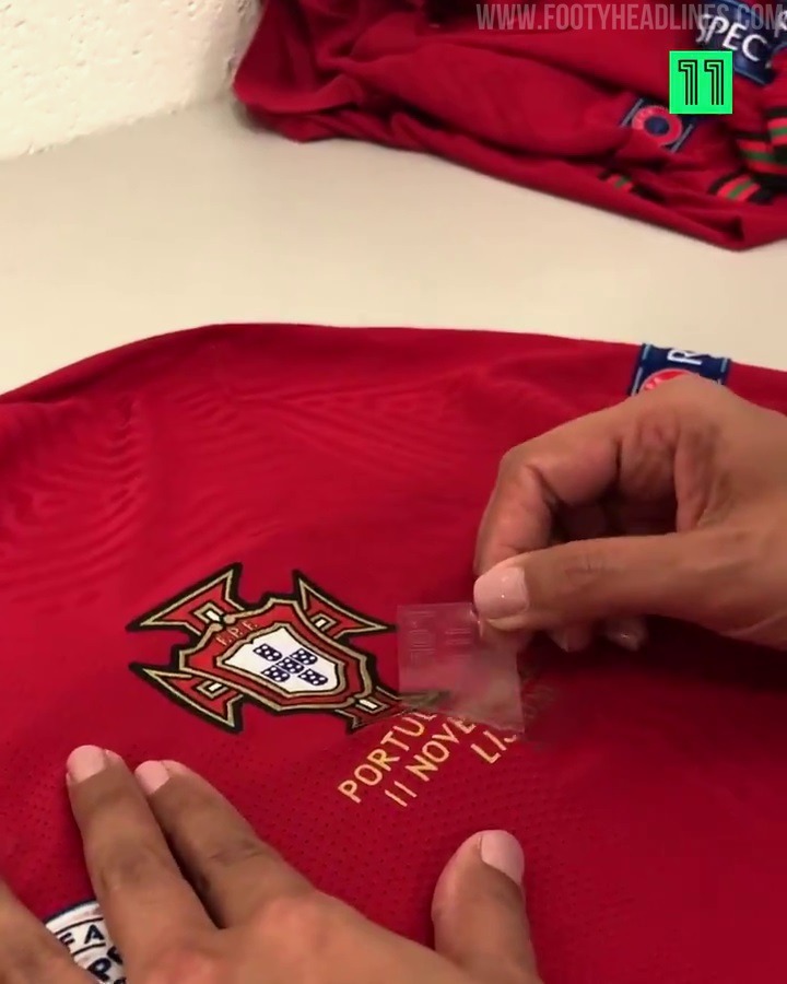 Die Anpassung für Portugals Trikots ist ziemlich zeitaufwändig. Portugals Trikots enthalten nicht nur die Spielernamen und -nummern als Anpassung, sondern drei zusätzliche Elemente - die Spielabzeichen, das UEFA Euro 2016-Siegerabzeichen sowie das UEFA Nations League-Siegerabzeichen.