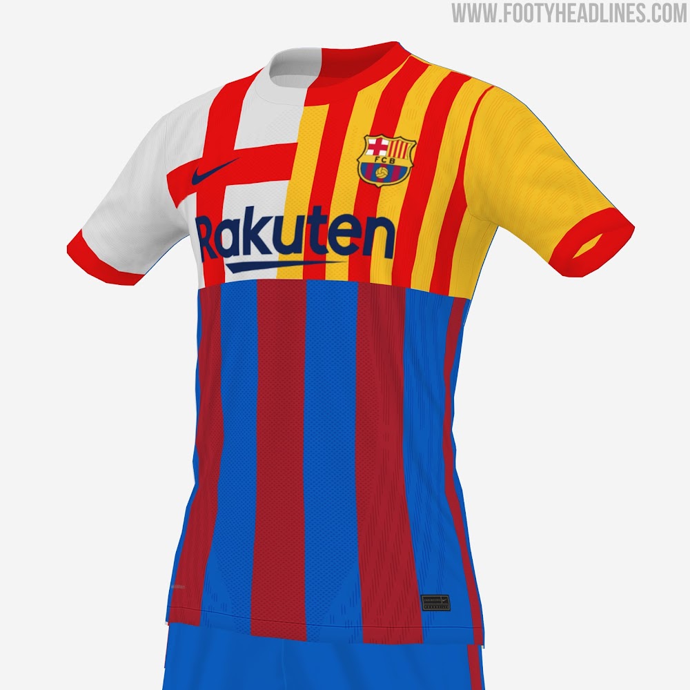 Das Barca 21-22 Trikot wird ein auffälliges und ungewöhnliches Design aufweisen, das vom Vereinswappen inspiriert ist. Wir haben uns vorgestellt, wie das Trikot in den Farben des Wappens aussehen würde.