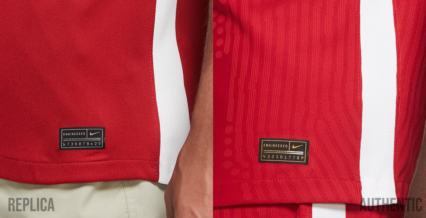 Vom Design her sind sich die authentischen und Replica-Trikots von Nike auf den ersten Blick sehr ähnlich. Du wirst jedoch schnell merken, ob jemand die authentische oder die Replica-Version trägt. Das Liverbird-Wappen und die Nike-Logos sind sehr unterschiedlich (heiß gedruckt vs. genäht und das Label unten links (authentic - gold, replica - silber).