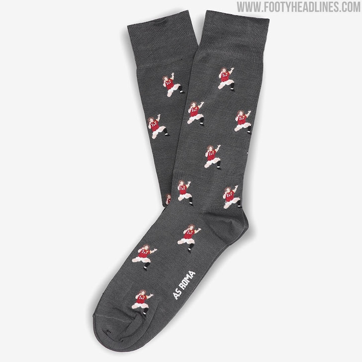 Unsere Lieblingsstücke sind wahrscheinlich die lässigen Socken. Die drei verschiedenen Socken sind mit Illustrationen versehen, die von den Club-Legenden Gabriel Batistuta, Francesco Totti und Bruno Conti inspiriert wurden.