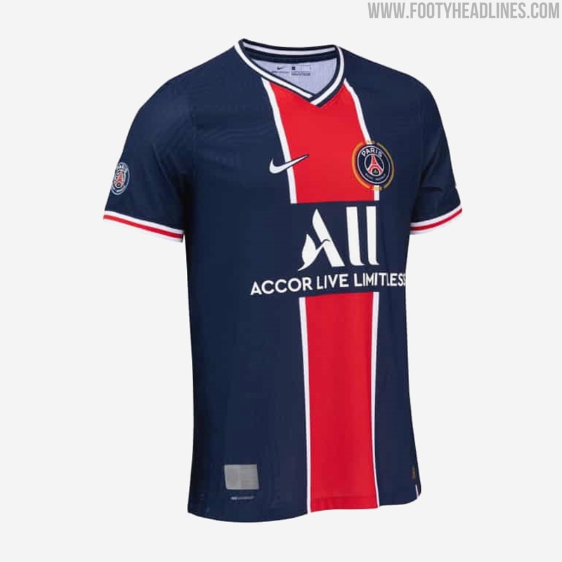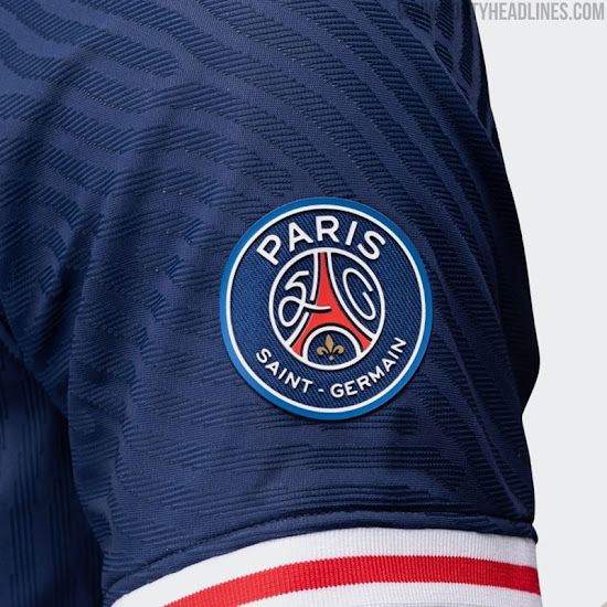 Das Nike Paris Saint-Germain 2020-21 50 Jahre Nike Paris Saint-Germain Jubiläumstrikot zum 50. Geburtstag basiert auf dem regulären Trikot und kombiniert das vom Vorbesitzer erfundene 'Hechter'-Design mit einigen zusätzlichen Details. Zunächst gibt es zwei Vereinslogos: eines auf dem rechten Ärmel und eines an der üblichen Stelle auf der linken Brust, umgeben von einem goldenen Kreis, der die Jahre 1970 und 2020 enthält. Das Vereinslogo auf dem Ärmel ist fast identisch, mit Ausnahme einer geschwungenen 50 neben dem Eiffelturm.