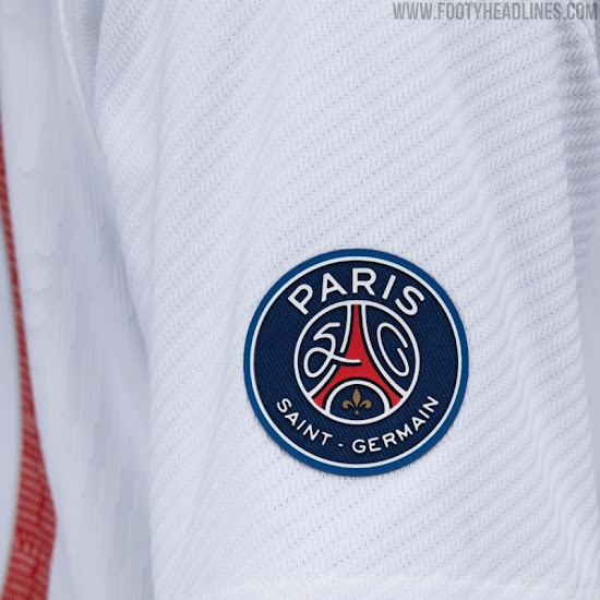 Ebenfalls auf dem regulären Trikot basiert das Nike Paris Saint-Germain 2020-2021 50th Anniversary Fußballtrikot mit weißer Basis und einem roten Mittelstreifen, der von zwei blauen Streifen umgeben ist. Der Umriss des Vereinslogos auf der Brust ist diesmal silberfarben.