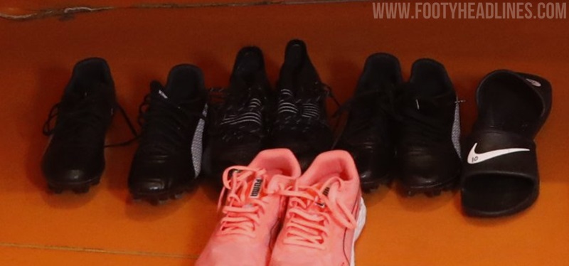 Zum Beispiel hatte Neymar drei verschiedene Fußballschuhe bei sich - zwei Puma King Platinum Schuhe sowie einen Next-Gen Puma Future Z ganz in Schwarz.