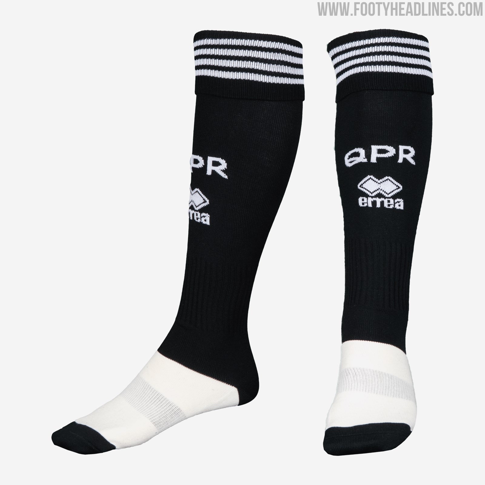 Schwarze Hosen und Stutzen runden den Look des neuen dritten QPR 2020-21 Trikots von Errea ab.