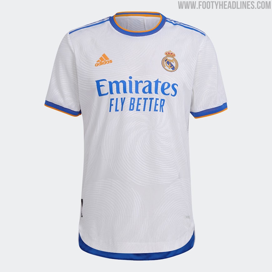 Das Adidas Real Madrid 2021-2022 Heim Fußballtrikot ist hauptsächlich weiß mit Logos in Orange - offiziell "Lucky Orange". Die Drei Streifen sitzen auf den Schultern und sind "Hi-res Blue". Das Shirt hat einen blauen Rundhalskragen mit orangefarbener Paspelierung.