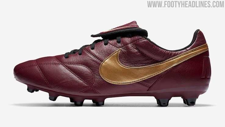Inspiriert von den alten Nike Tiempo Ronaldinho 10R Fußballschuhe von 2007, kombinieren die neuen 'Dark Beetroot / Metallic Gold / Schwarz' Nike Premier II Fußballschuhe ein dunkles kastanienbraunes Obermaterial mit goldenen Logos und schwarzen Applikationen.