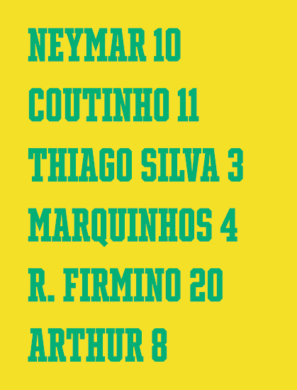 Brasiliens Trikot-Schriftart ist inspiriert von der Trikot-Schriftart, die Athleta für die brasilianischen Trikots von 1970 verwendet hat. Die Umbro-Brasilienbausätze von 1970 enthielten eine andere Schriftart (über Mantos do Futebol).