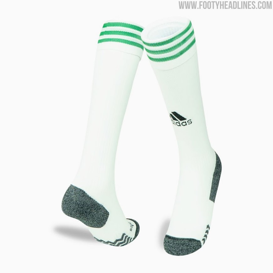 Die Hosen und die Stutzen des Celtic FC 2021-2022 Heimtrikots sind beide weiß mit grünen 3-Streifen und schwarzen Adidas-Logos.