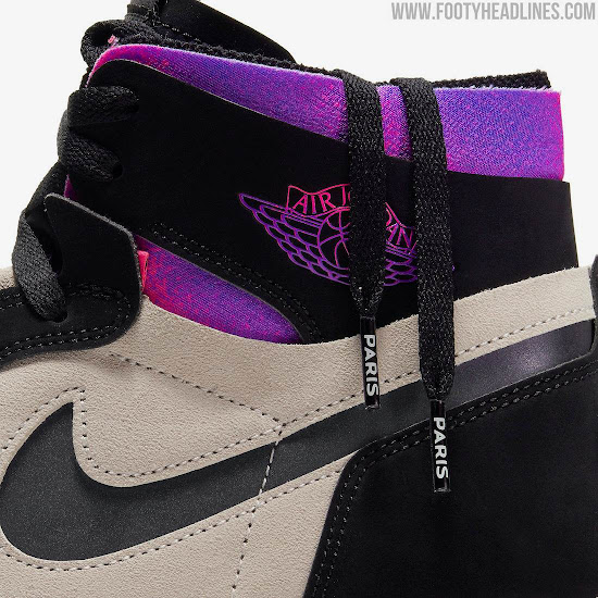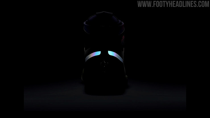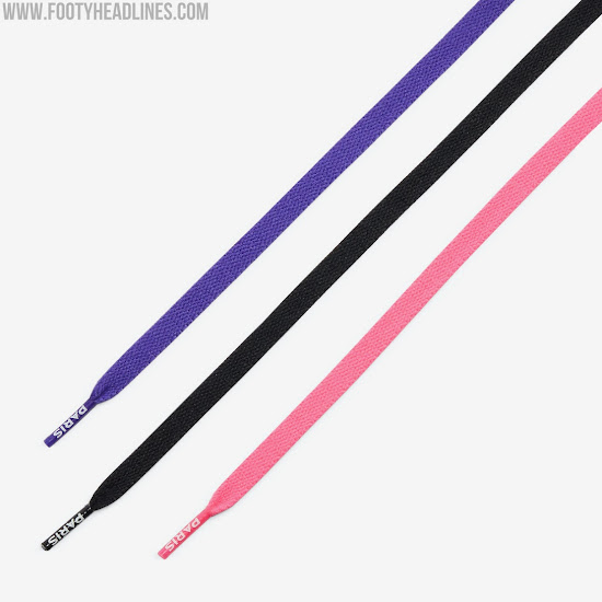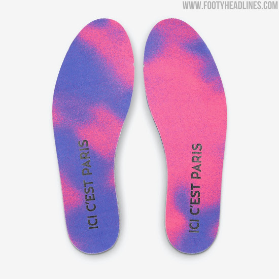 Die Highlights des Schuhs sind die Farbverläufe, die sich um den Kragen und das Wings-Motiv finden, passend zum PSG-Trikot. Der Sneaker hat reflektierende, schillernde, eingeschnittene Swooshes an den Seiten. Ein irisierendes Psychic Purple und Hyper Pink PSG Abzeichen an den Fersen vervollständigt das Design.