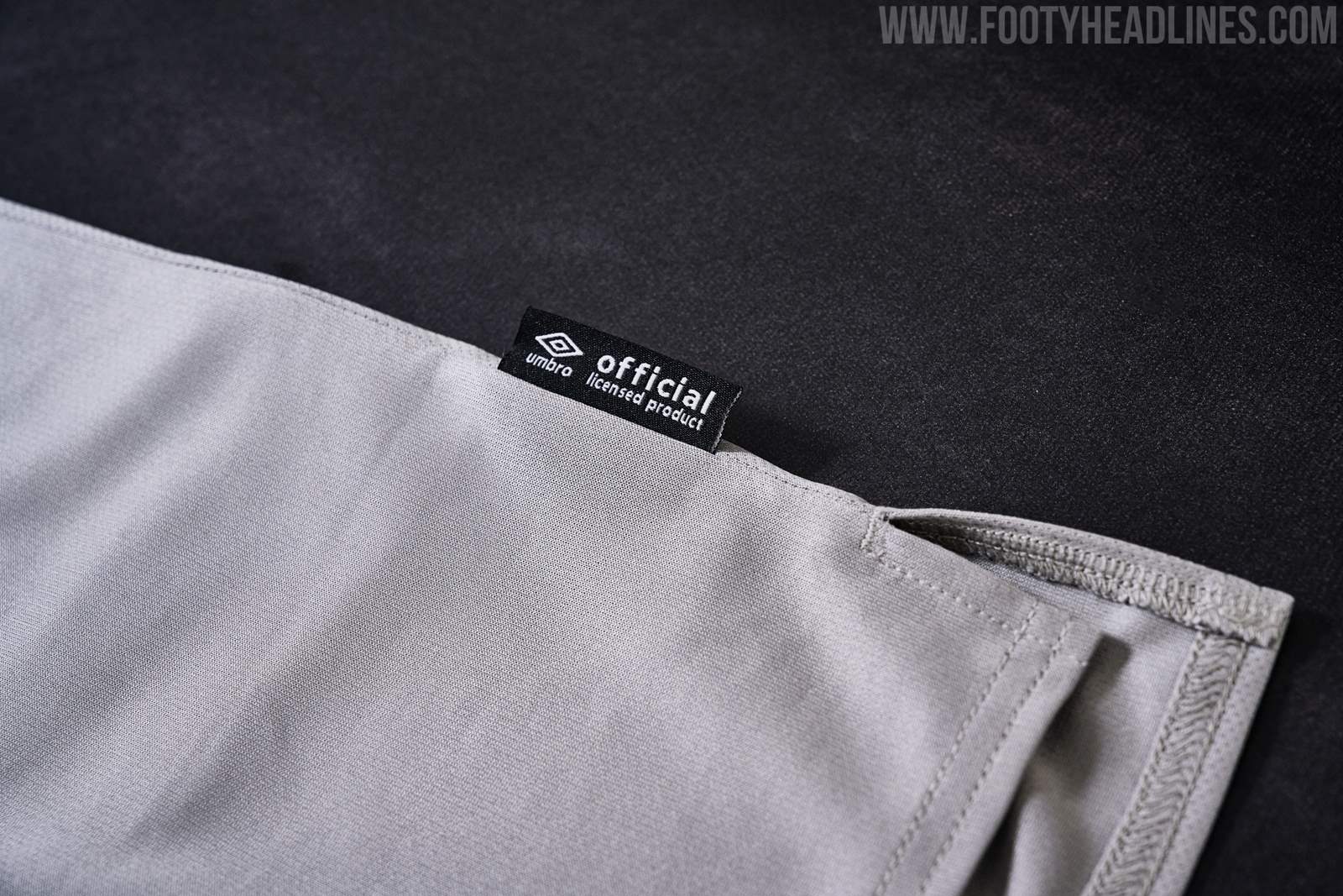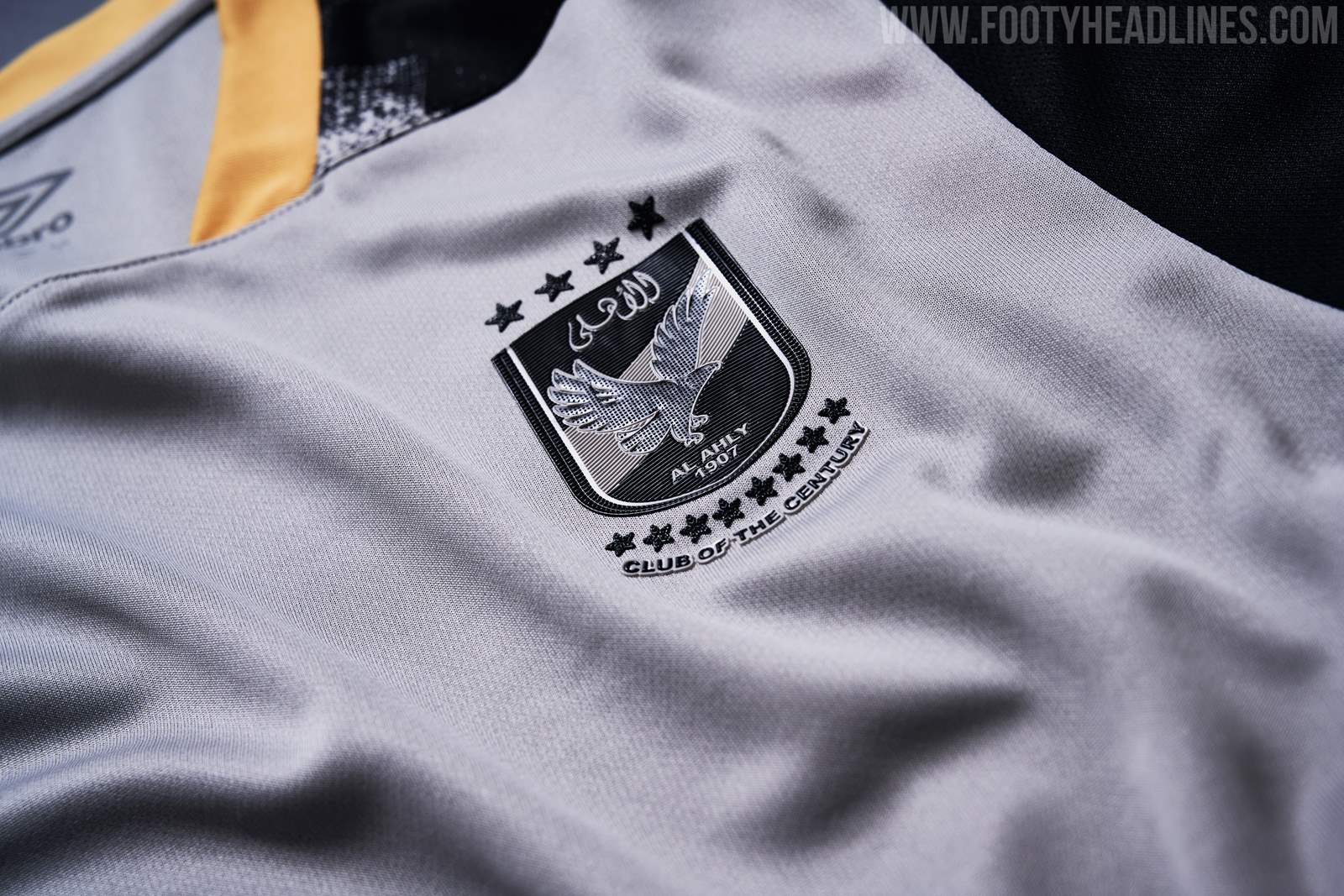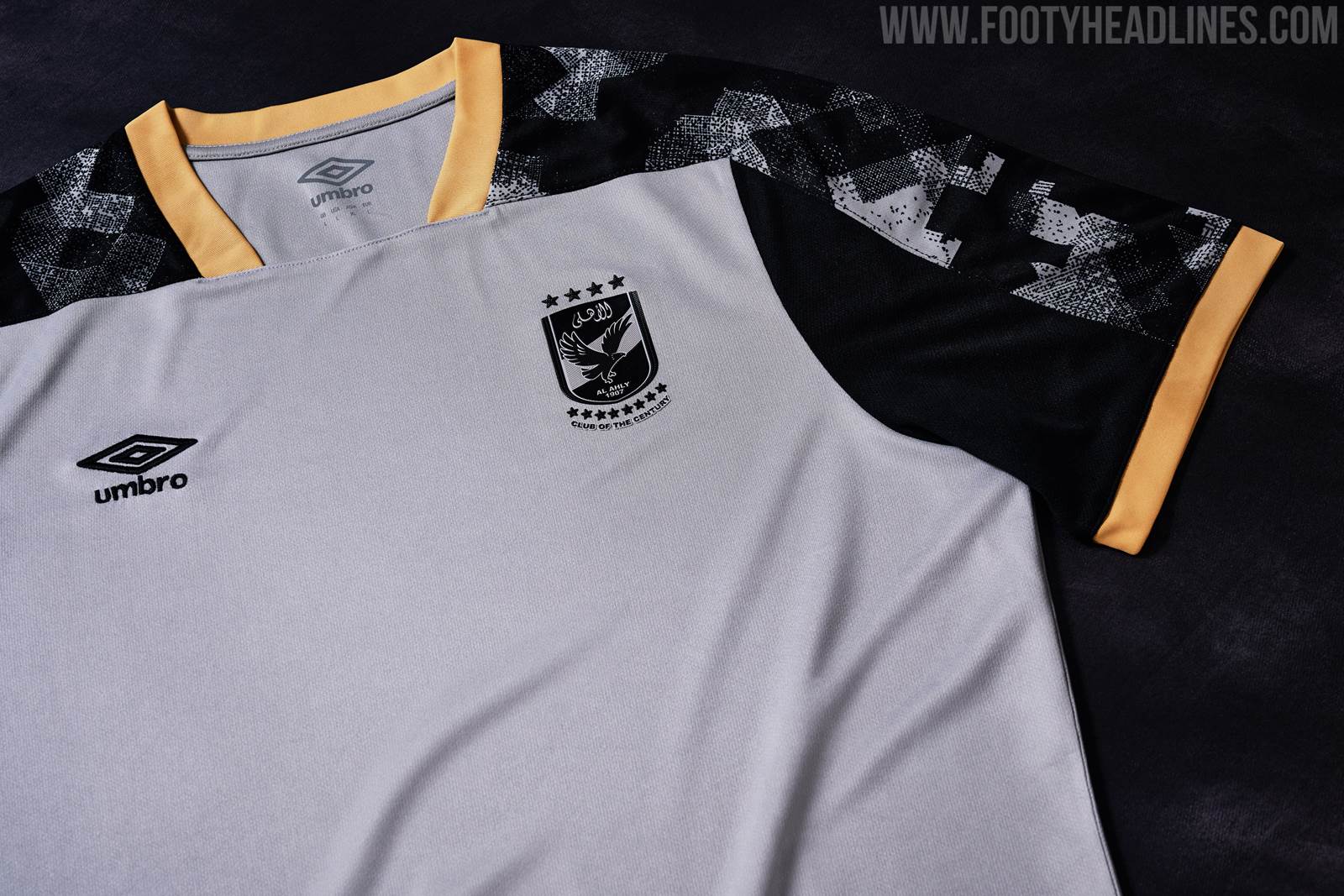 Das Umbro Al Ahly 2020-2021 Auswärtstrikot ist hauptsächlich grau mit schwarzen Ärmeln, die einen grauen Camouflage-Druck aufweisen. Der Halsausschnitt und die Ärmelbündchen sind goldfarben, während die Sponsorenlogos schwarz sind, einschließlich einer monochromen Wiedergabe des Vereinslogos auf der linken Brust.