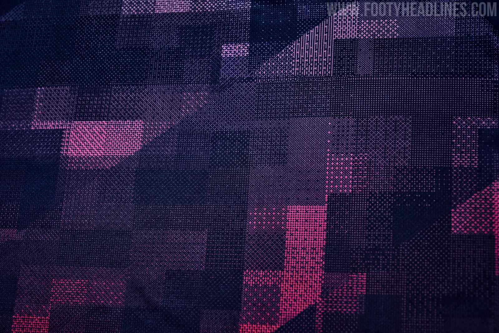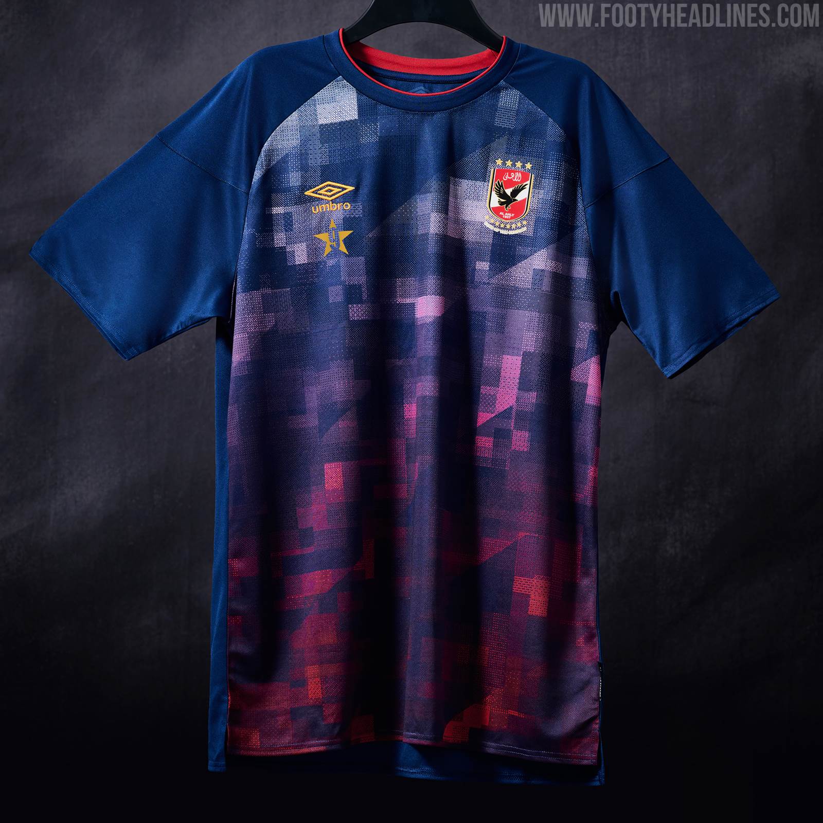 Das Umbro Al Ahly 2020-21 drittes Fußballtrikot ist überwiegend blau mit einem abstrakten roten Grafikmuster auf dem Körper, das aus verpixelten Formen besteht, und führt einen neuen Look ein. Ein schlichter blauer Rundhalskragen und blaue Ärmelbündchen, erstere mit roter Einfassung, ergänzen das Erscheinungsbild.