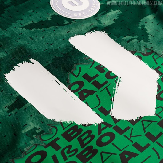 Das Trikot ist in der Unisports-Signaturfarbe Dunkelgrün gestaltet, wobei das Wort Fußball in verschiedenen Sprachen auf der Vorderseite des Trikots geschrieben ist.