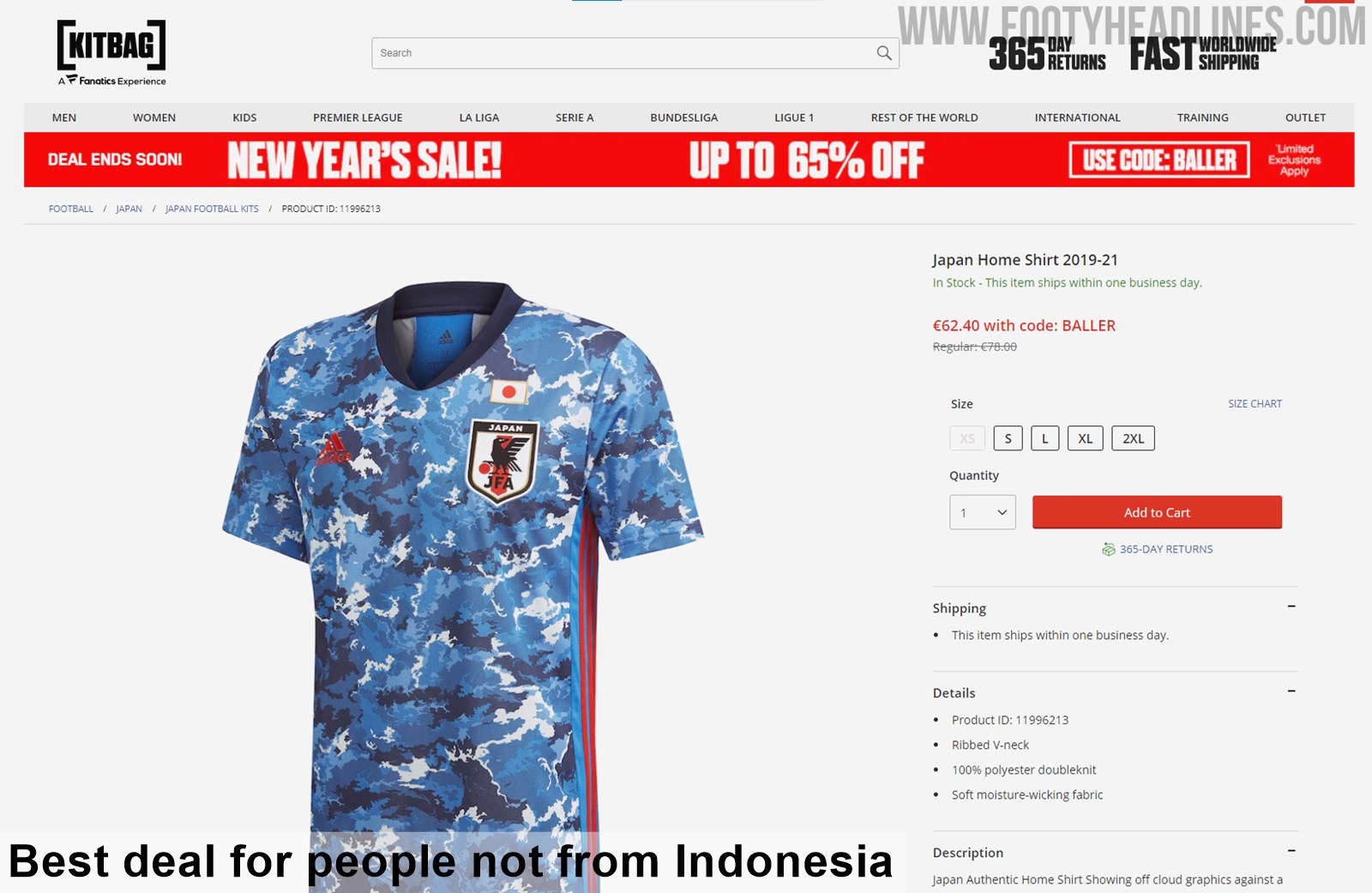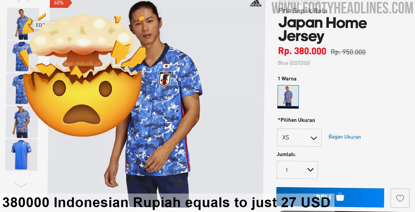 Allerdings ist das Japan Trikot 2020 nur auf der indonesischen Adidas Webseite zu diesem Wahnsinnspreis erhältlich - auf den europäischen Adidas Webseiten hat es den Standardpreis von 75 Pfund (90 Euro).