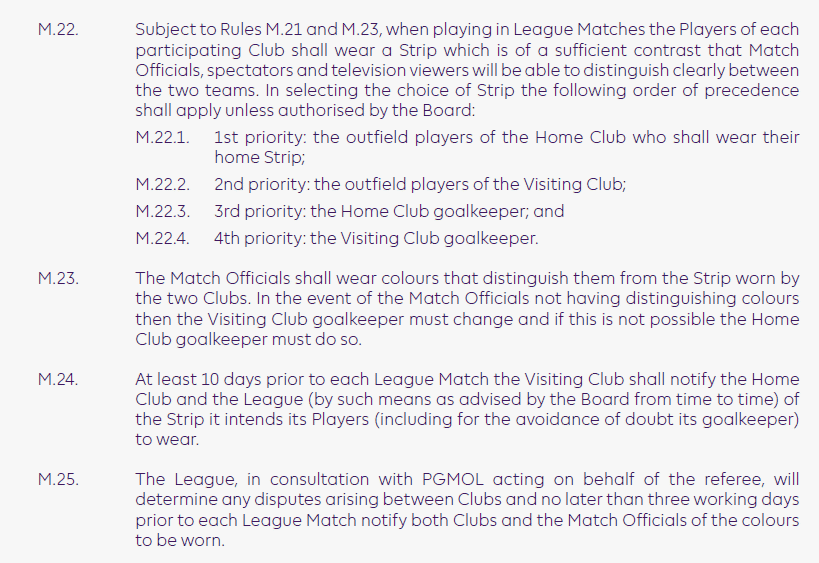 M.24.:Mindestens 10 Tage vor jedem Ligaspiel muss der Gastverein dem Heimverein und der Liga (auf eine Weise, die vom Vorstand von Zeit zu Zeit empfohlen wird) mitteilen, welches Trikot seine Spieler (einschließlich des Torwarts) zu tragen beabsichtigen.