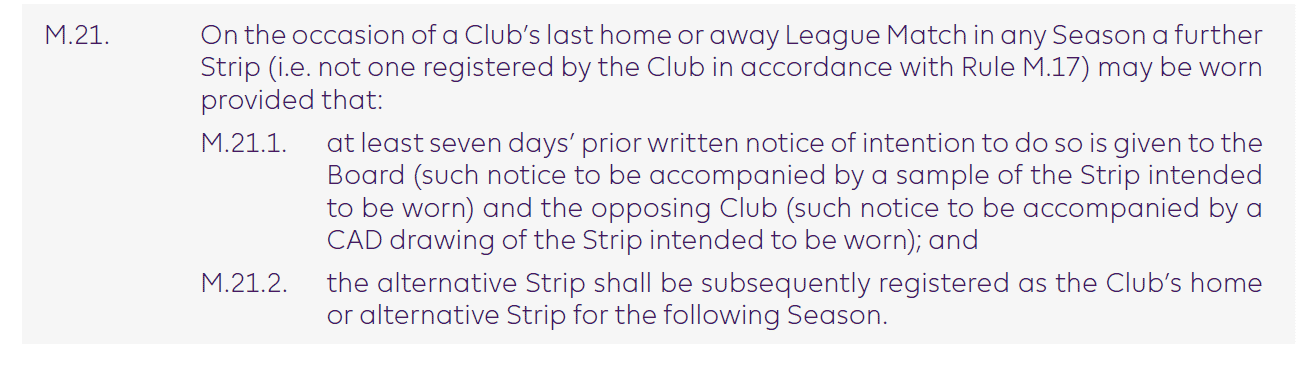 M.24.:Mindestens 10 Tage vor jedem Ligaspiel muss der Gastverein dem Heimverein und der Liga (auf eine Weise, die vom Vorstand von Zeit zu Zeit empfohlen wird) mitteilen, welches Trikot seine Spieler (einschließlich des Torwarts) zu tragen beabsichtigen.