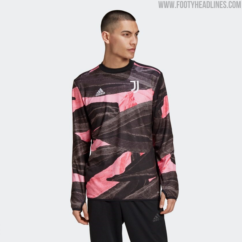 Das neue Adidas Juventus FC 2021 Pre-Match-Top hat ein auffälliges Design in Schwarz, Pink und Gold - es ist schwarz und rosa mit einer Pinselstruktur auf der gesamten Oberfläche.