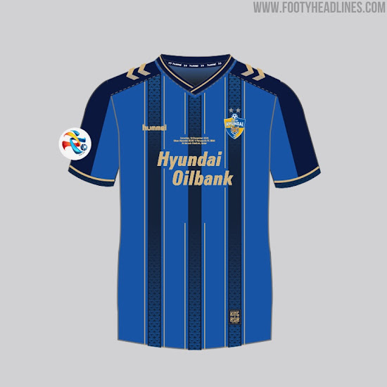 Basierend auf dem regulären Trikot kombiniert das Hummel Ulsan Hyundai 2020 Sonder-Trikot einen traditionellen Streifenlook, der sich auf der Rückseite mit Ärmeln in einem helleren Blauton fortsetzt. Auf den Schultern verläuft ein dunkelblauer Streifen, der vom V-Ausschnitt bis zu den Ärmelbündchen reicht.