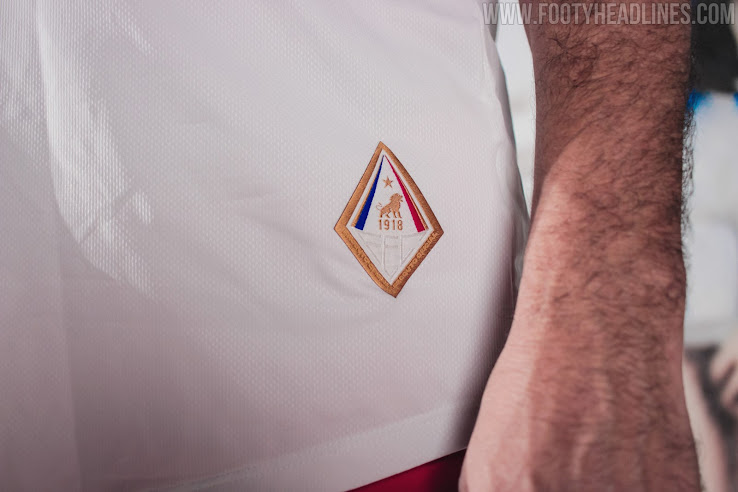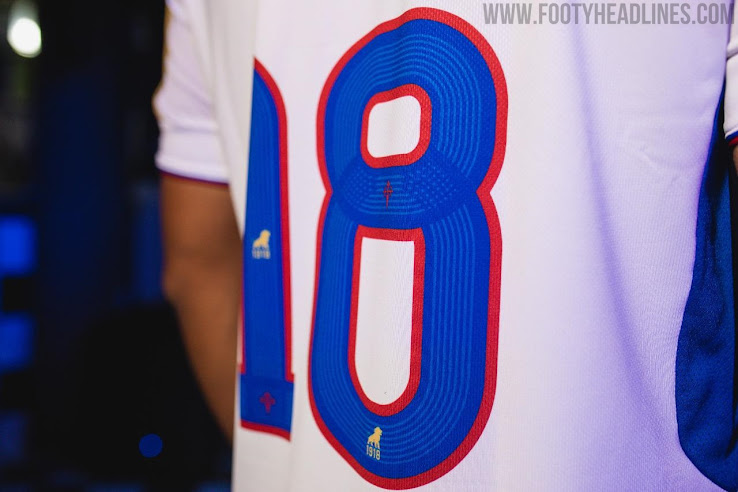 Hauptsächlich weiß, kombiniert das Leão 1918 Fortaleza 2021 Auswärtstrikot diese Basis mit einem einfachen Rundhalskragen und zwei dünnen goldenen Linien, die vom Kragen zu den Ärmelbündchen verlaufen. Die Ärmelbündchen sind dick und weiß mit blau/rotem Besatz, während eine goldene Version der Vereinsmarke auf der linken Brust zu sehen ist.