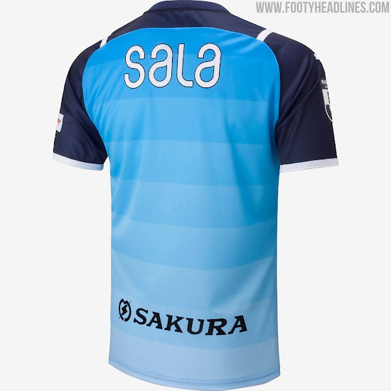 Eine himmelblaue Version des japanischen Paradiesfliegenfängers, der auch im Vereinslogo vorkommt, sitzt auf der Vorderseite und wurde mit geometrischen Formen gestaltet. Der V-Ausschnitt ist marineblau mit einem himmelblauen Vorderteil, während sich auf jeder Schulter ein weißer Streifen befindet.