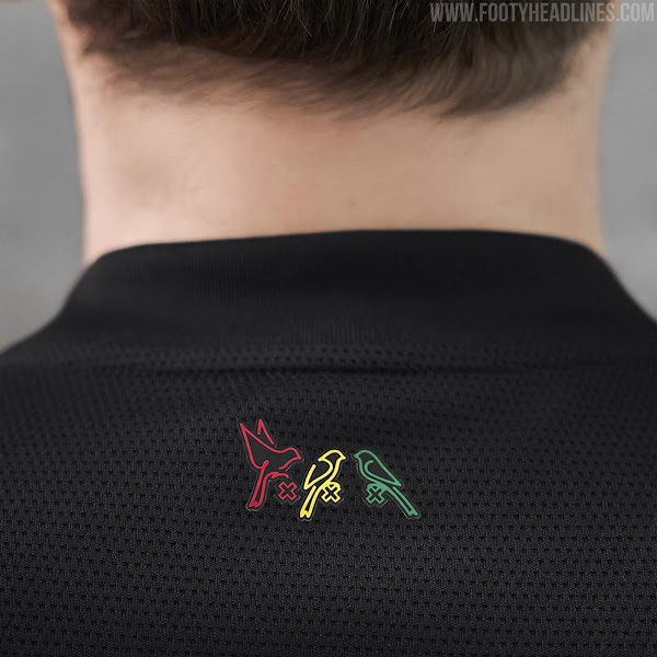 Die Logos auf der Vorderseite des neuen dritten Ajax-Trikots sind einfarbig rot, passend zum Innenfutter am Hals. Drei Vögel in den Farben Rot, Gelb und Grün erscheinen auf der oberen Rückseite des Trikots.