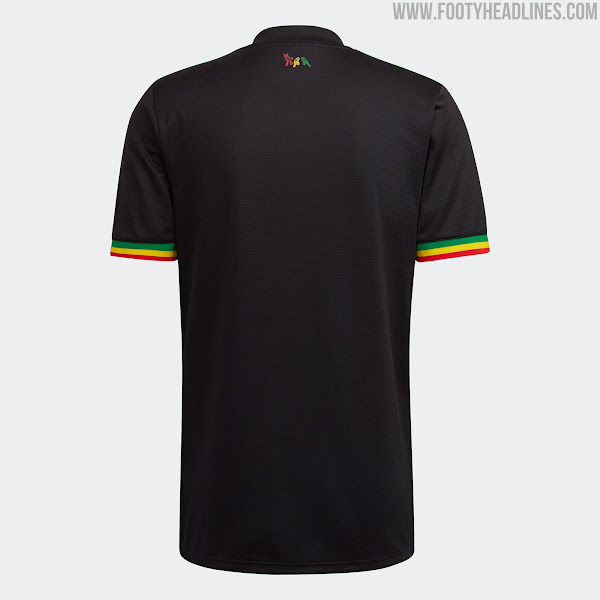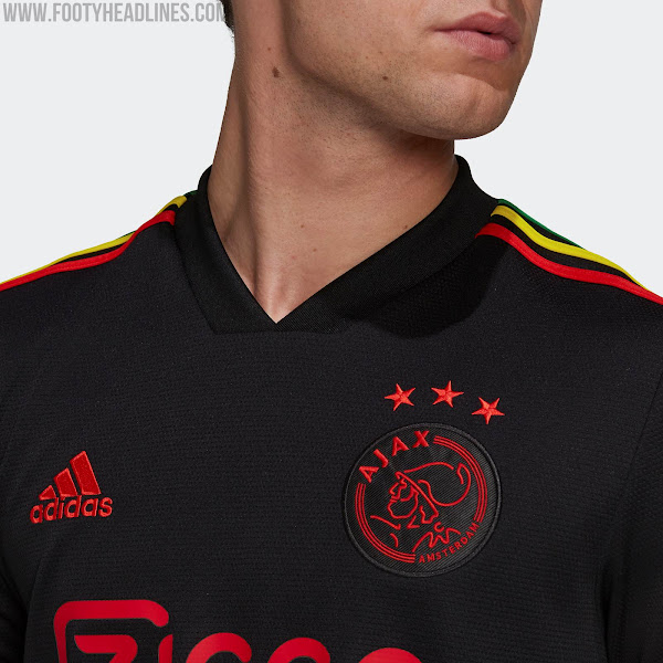 Das dritte Trikot von Ajax 21-22 ist hauptsächlich schwarz und hat einen V-Kragen. Die Rastafari-Farben Rot, Grün und Gold werden für die 3 Streifen verwendet, die sich auf den Schultern des dritten Trikots von Adidas Ajax 2021-2022 sowie auf den Ärmelbündchen befinden.