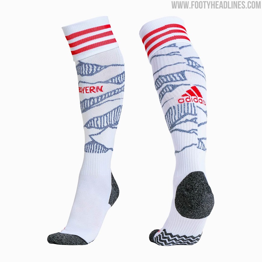 Die Hosen des dritten Trikots des FC Bayern 2021-22 sind weiß. Die Stutzen sind ebenfalls weiß, haben aber das gleiche Muster wie das Trikot.