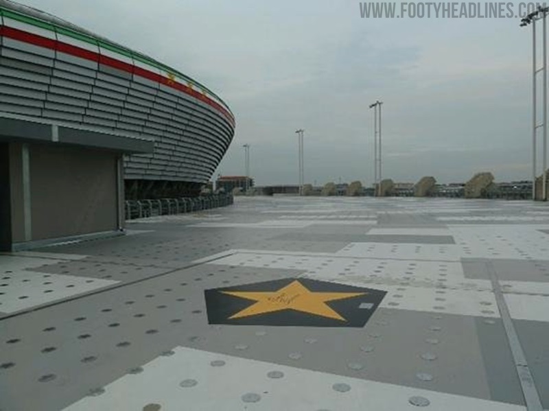 Eine maßgeschneiderte "10 Years at Heim"-Grafik erscheint auf dem Innenkragen des Juventus Heimtrikots 2021-22 und bezieht sich auf das 10-jährige Jubiläum der Eröffnung des Juventus Stadions. Das 'A' ist stilisiert, um wie der ikonische Bogen des Stadions auszusehen. Darüber hinaus erscheint ein subtiles Muster innerhalb der schwarzen Streifen, inspiriert von den Sternen auf dem Juve Walk of Fame.