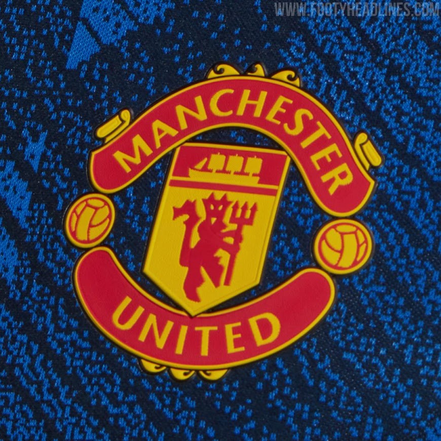 Das Adidas Man United 21-22 drittes Fußballtrikot ist blau mit einem dezenten Allover-Musterdruck in schwarz, der dezente 'M's in einem Retro-inspirierten Stil zeigt.