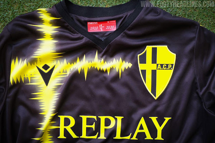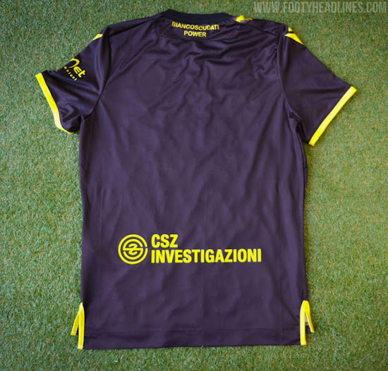 Hauptsächlich schwarz, weist das dritte Trikot von Macron Padova 20-21 fluoreszierende gelbe Akzente auf, wie die Ärmelbündchen, das Macron Logo auf beiden Ärmeln und die Sponsorenlogos, mit Ausnahme des Macron Logos auf der rechten Brust, das schwarz ist. Auf der linken Brust befindet sich eine einfarbige, fluoreszierende gelbe Wiedergabe des Padova-Logos.